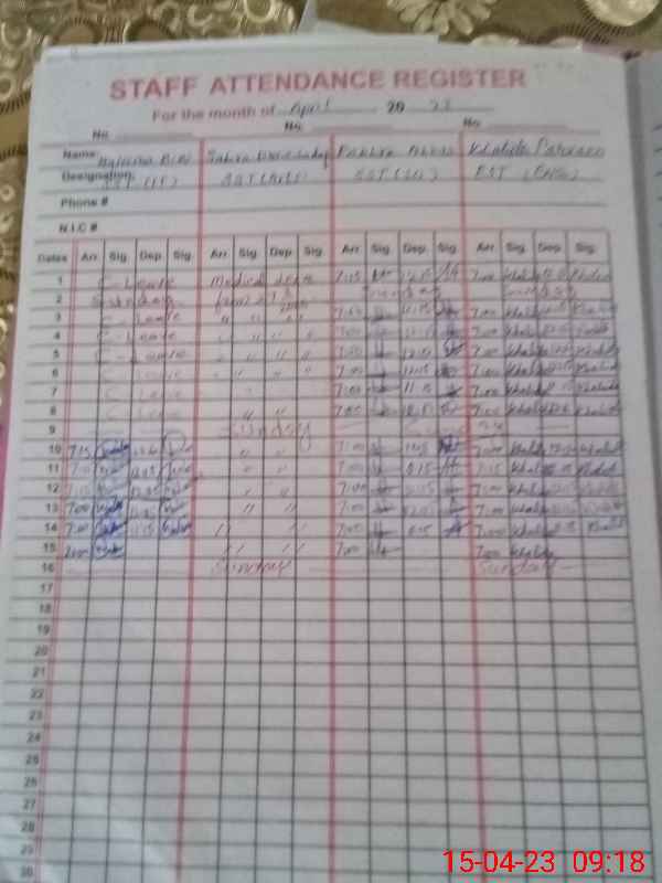 | CNIC | Full Name | Designation | R/C | Absence During Last Calender Month |