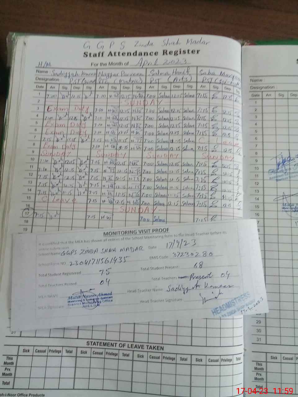 | Attendance Register | Head Teacher | MEA with School | Visit Proof |