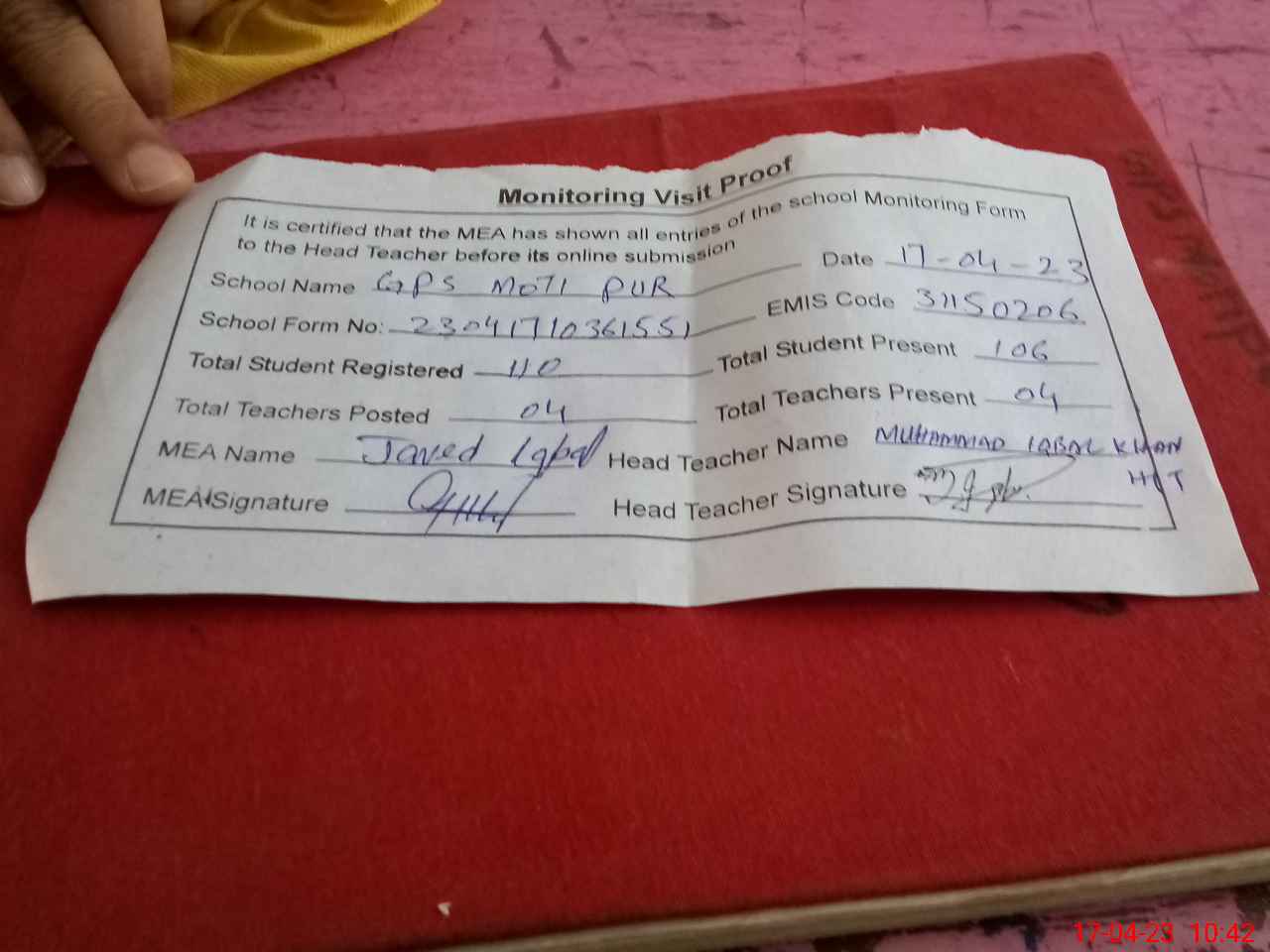 | Attendance Register | Head Teacher | MEA with School | Visit Proof |