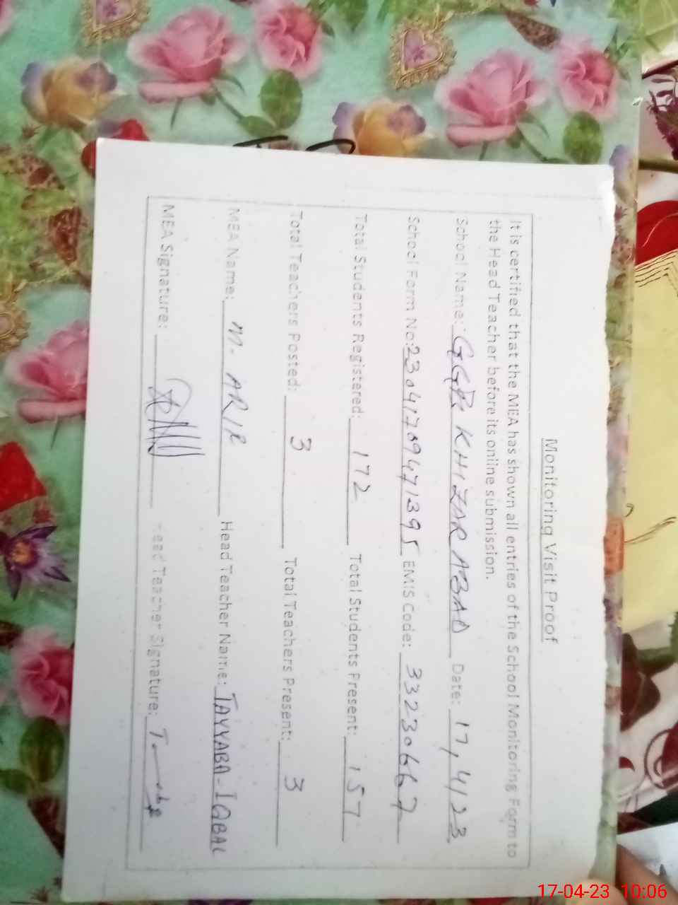| Attendance Register | Head Teacher | MEA with School | Visit Proof |