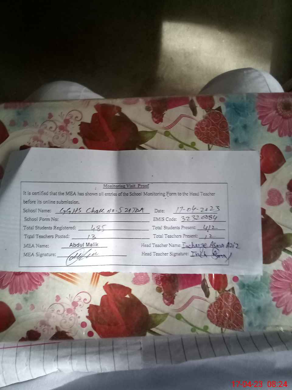 | EMIS Code: 32320084 | Name of School: GGHS CHAK NO. 521/TDA | |||