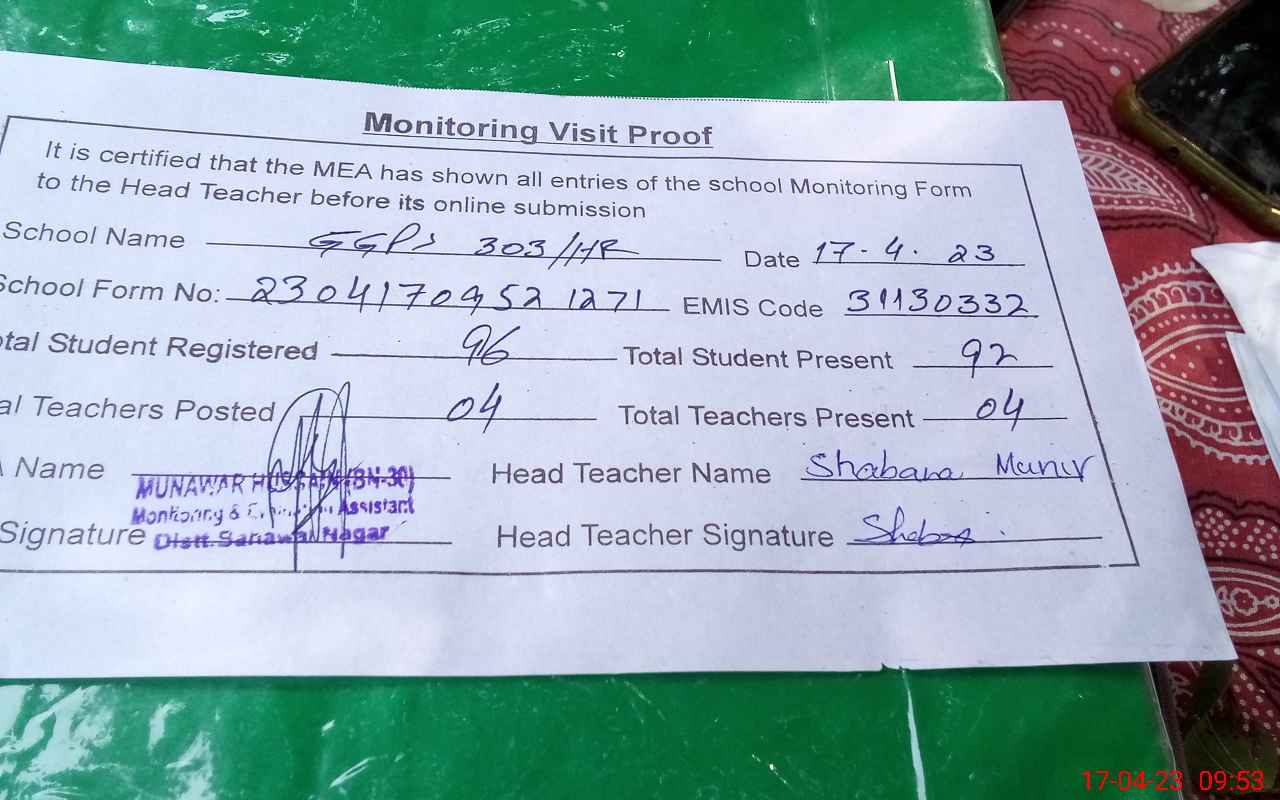 | EMIS Code: 31130332 | Name of School: GGPS CHAK NO. 303/HR | |||