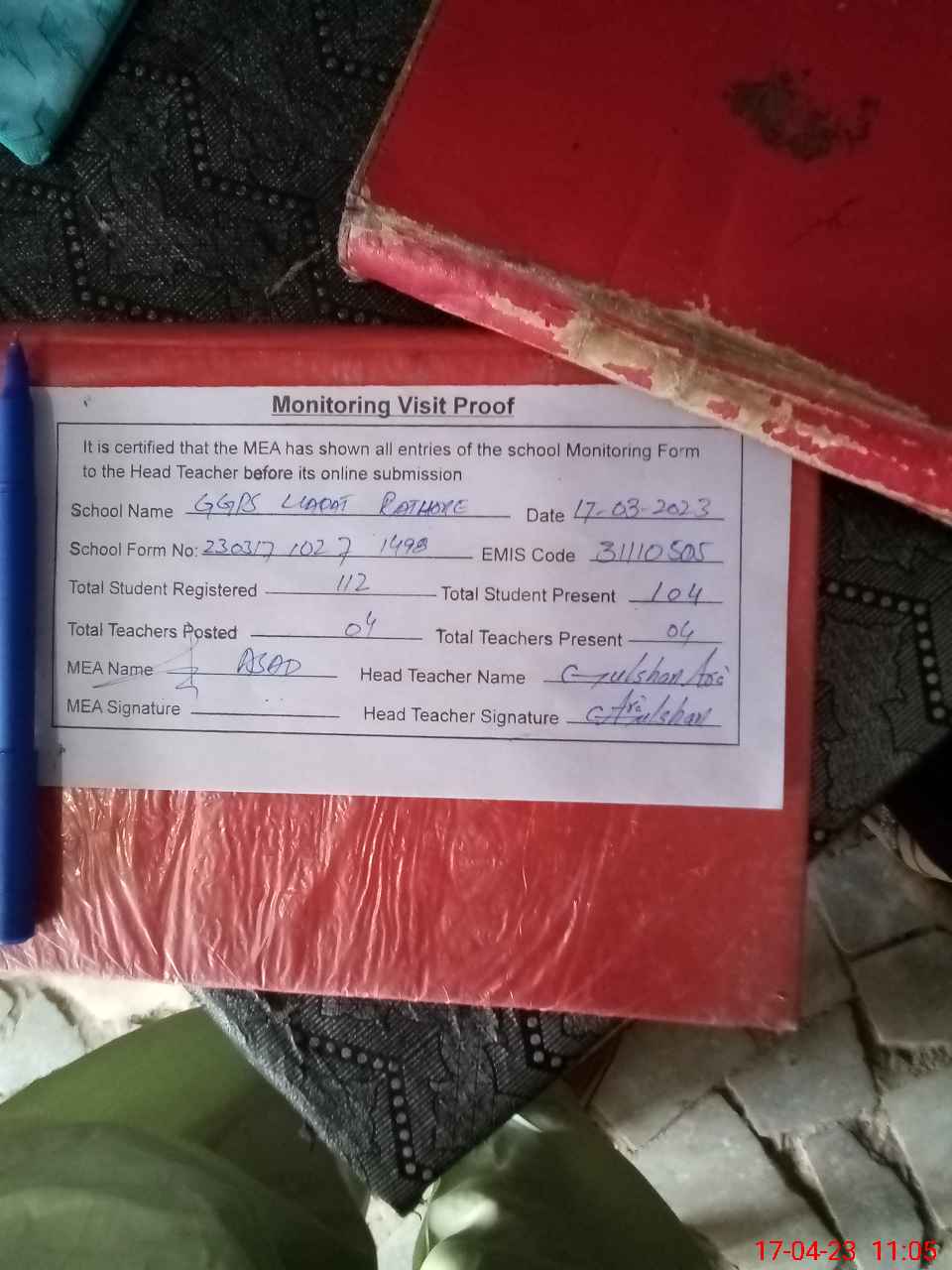| Attendance Register | Head Teacher | MEA with School | Visit Proof |