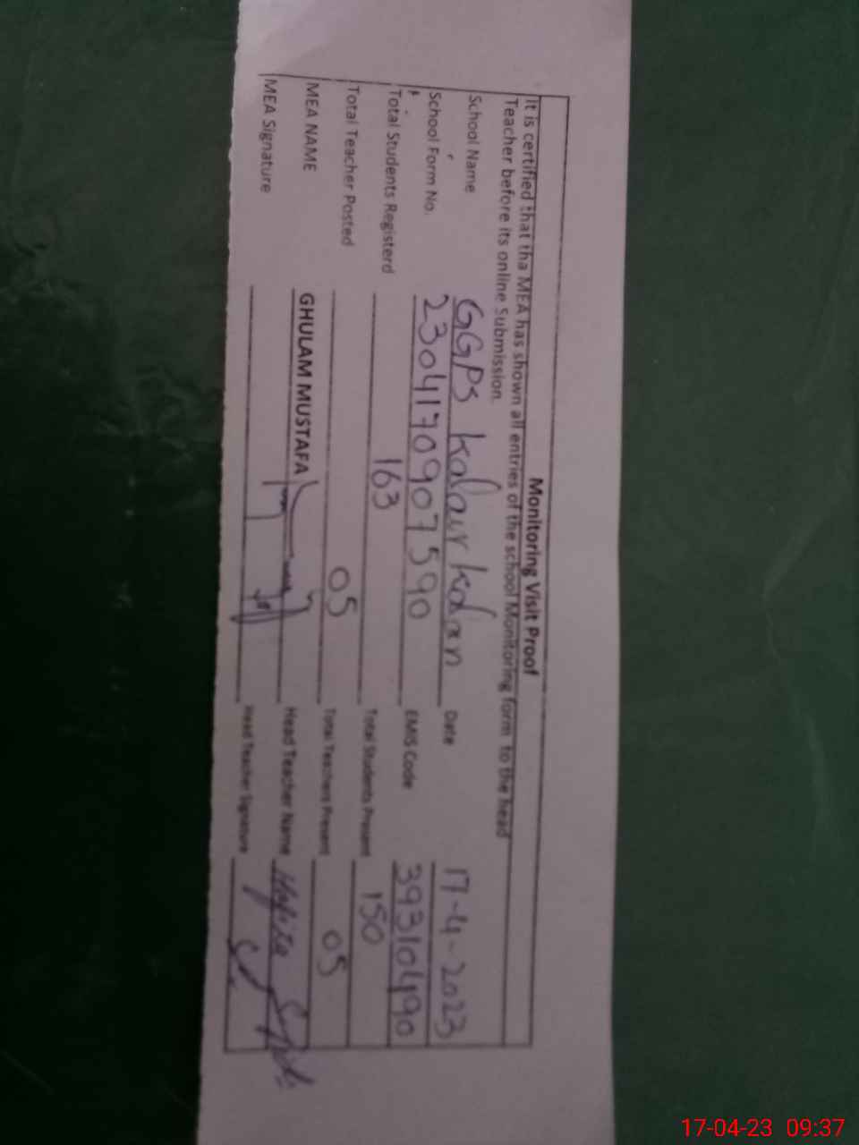 | Attendance Register | Head Teacher | MEA with School | Visit Proof |