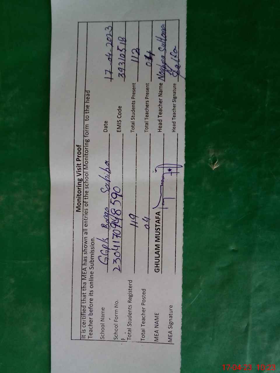 | Total no. of Classrooms: 4 No. of Classrooms Used for Teaching: 4 No. of Classrooms Storing Old Furniture, FTBs, etc: 0Comments if Any: It is certified that as per head teacher statement last NSB fund an amount of rupees 73412 credited in the month of March 2023 |