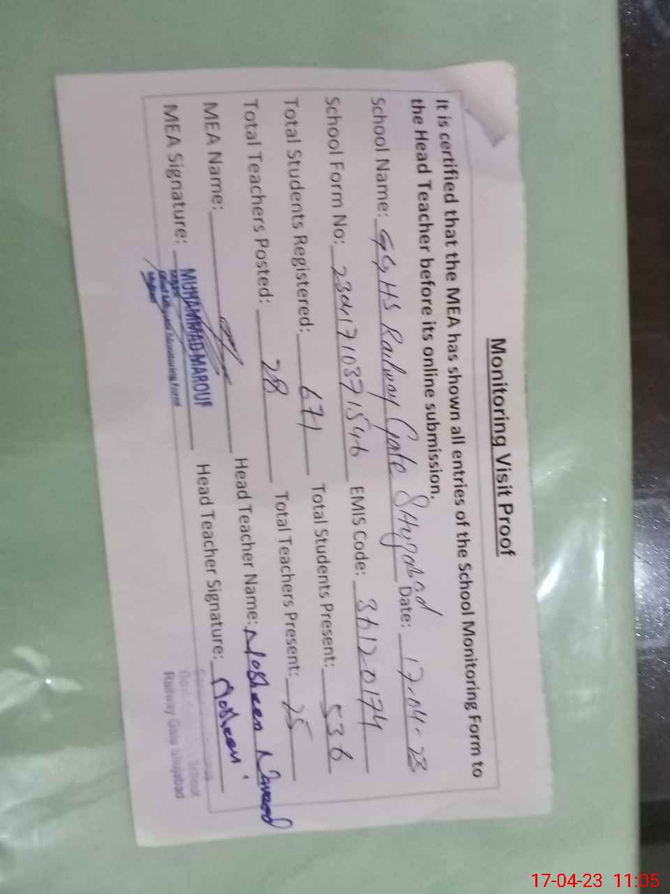 | EMIS Code: 36120174 | Name of School: GGHS MC RAILWAY GATE SHUJABAD | |||