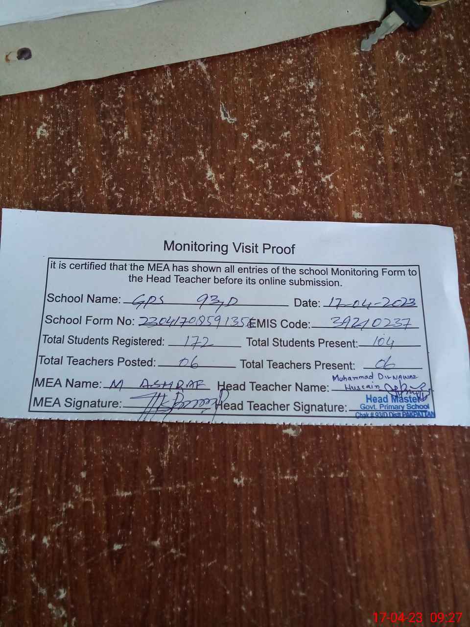 | Attendance Register | Head Teacher | MEA with School | Visit Proof |
