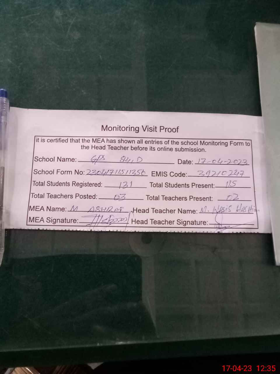 | Attendance Register | Head Teacher | MEA with School | Visit Proof |