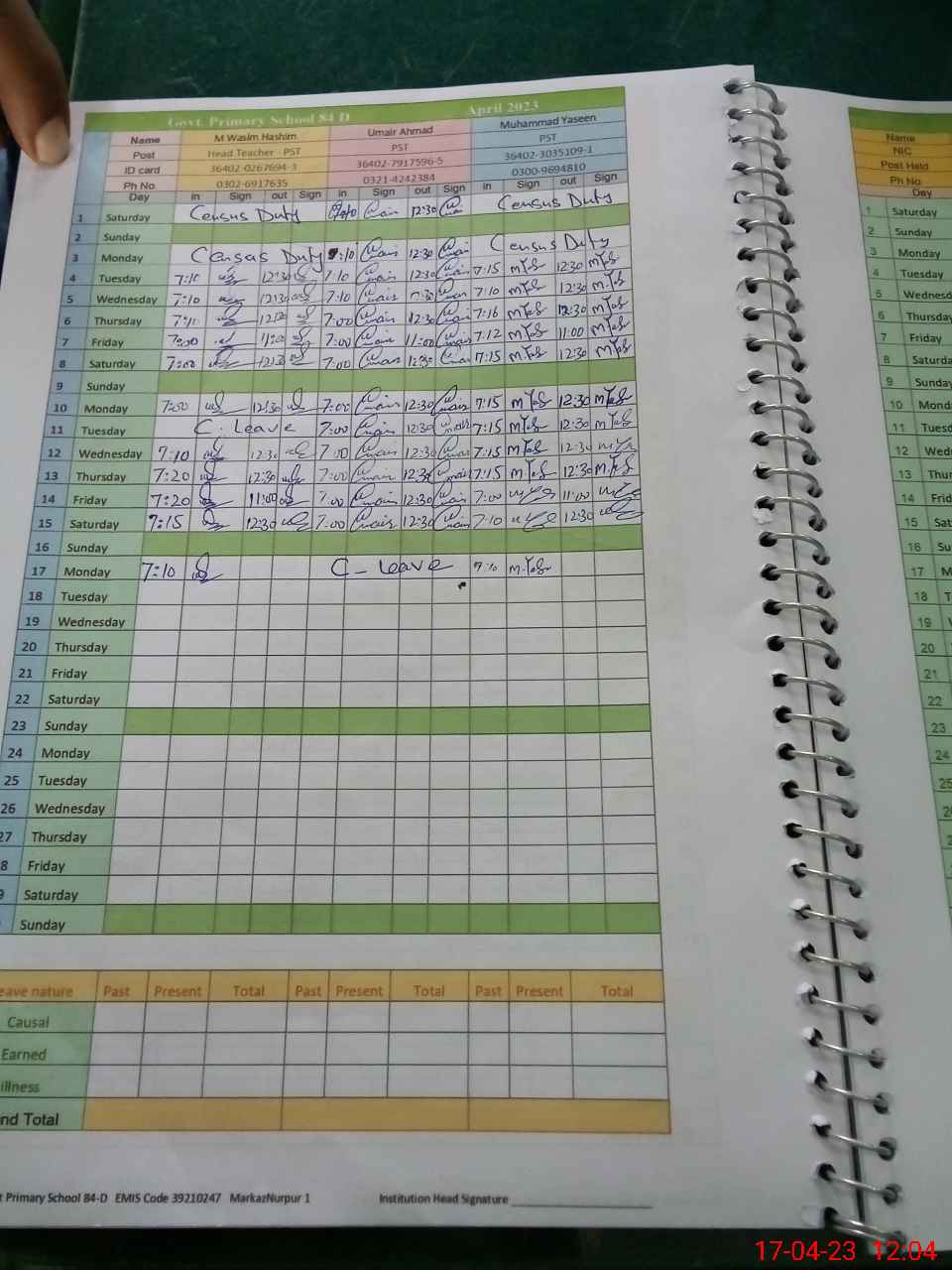 | CNIC | Full Name | Designation | R/C | Absence During Last Calender Month |