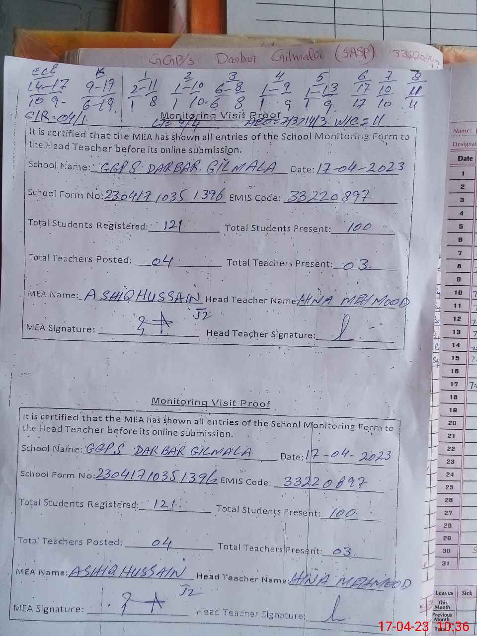 | Attendance Register | Head Teacher | MEA with School | Visit Proof |