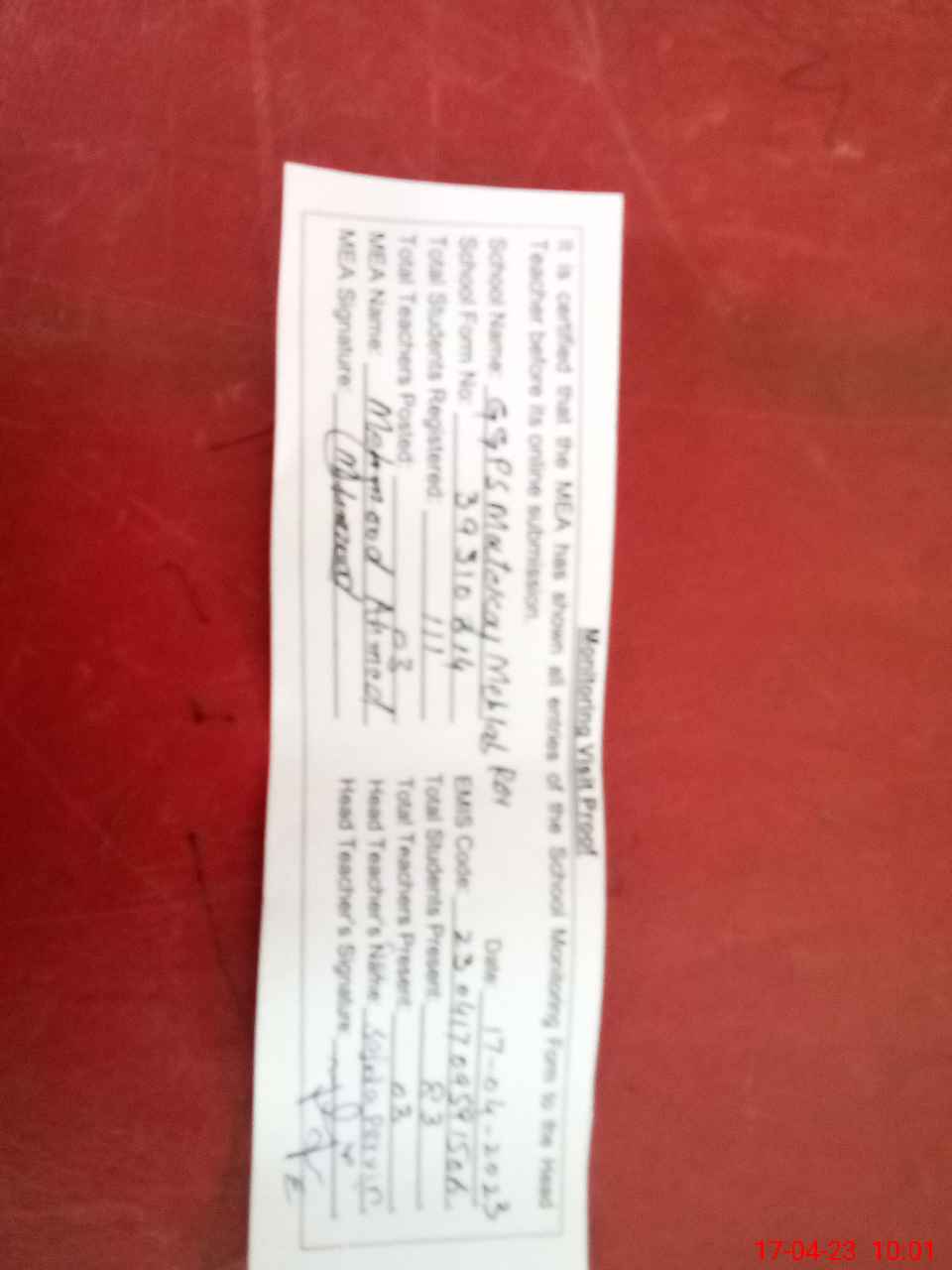 | Attendance Register | Head Teacher | MEA with School | Visit Proof |
