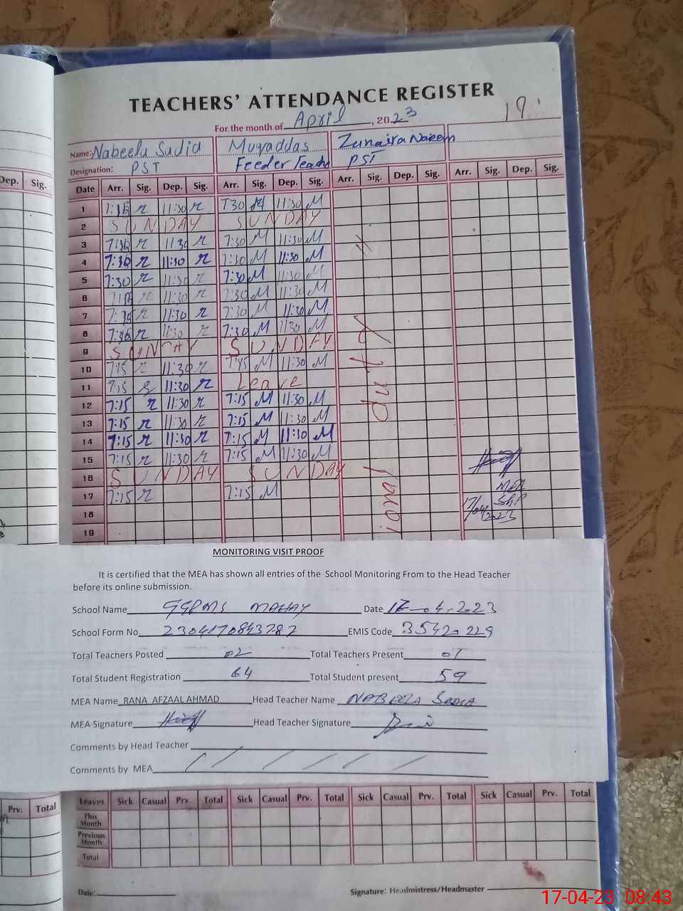 | Attendance Register | Head Teacher | MEA with School | Visit Proof |