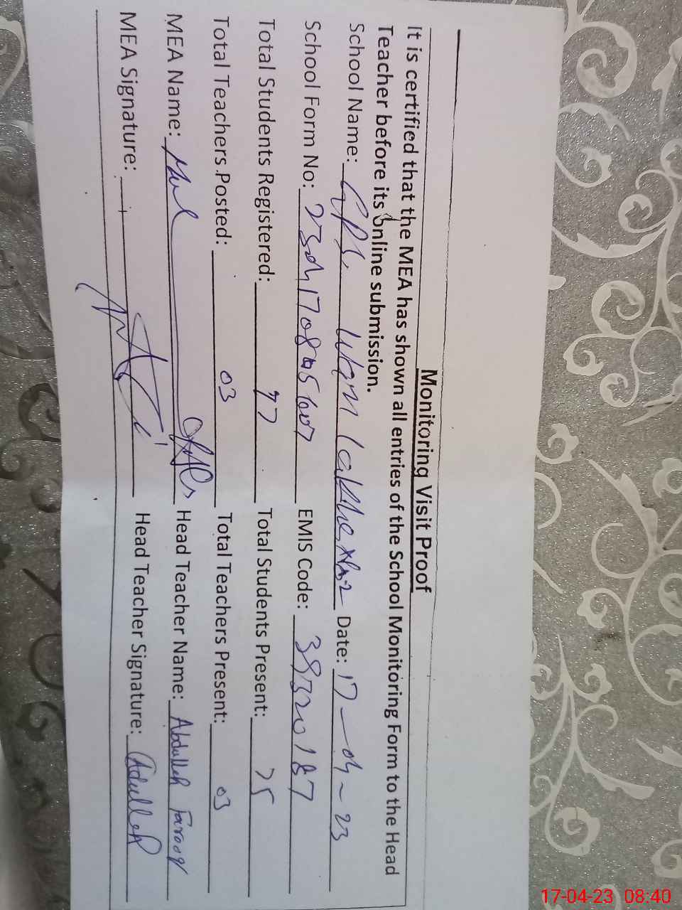 | Attendance Register | Head Teacher | MEA with School | Visit Proof |