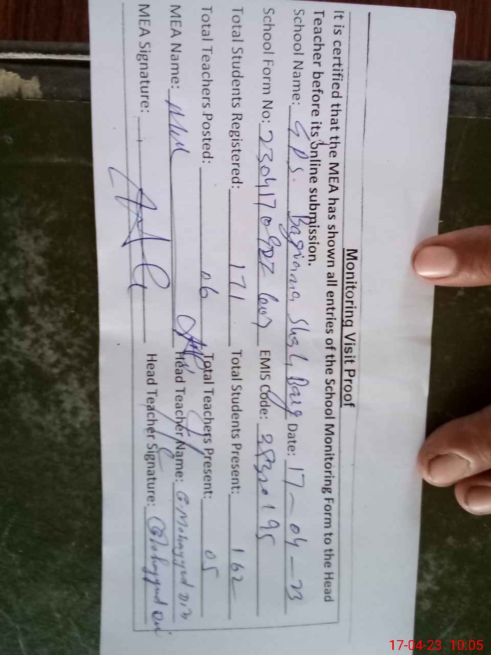 | Attendance Register | Head Teacher | MEA with School | Visit Proof |