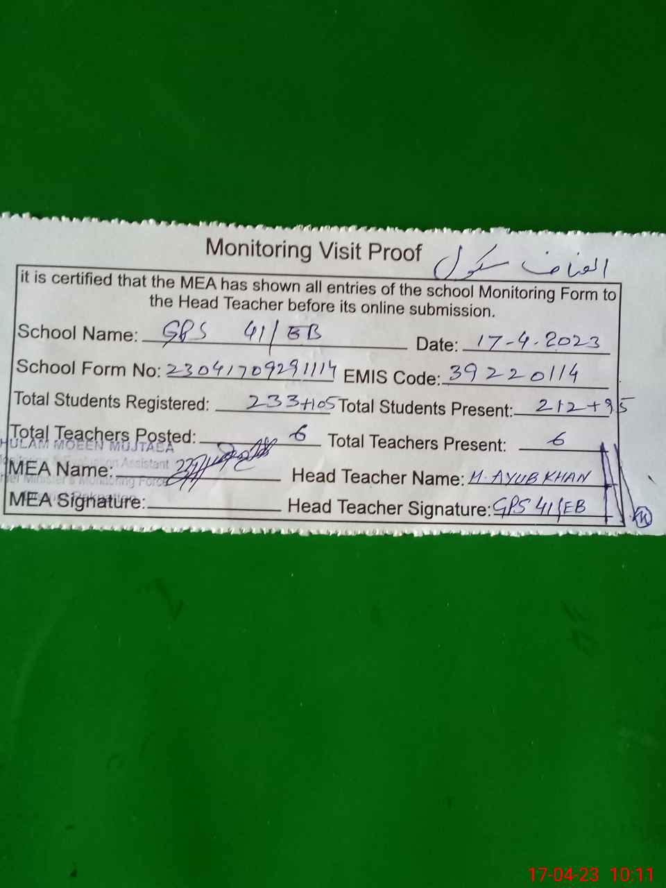 | EMIS Code: 39220114 | Name of School: GPS CHAK NO. 41 EB | |||