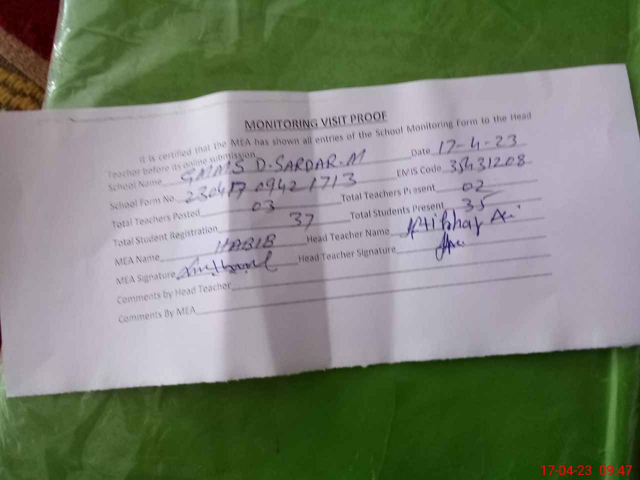 | Attendance Register | Head Teacher | MEA with School | Visit Proof |