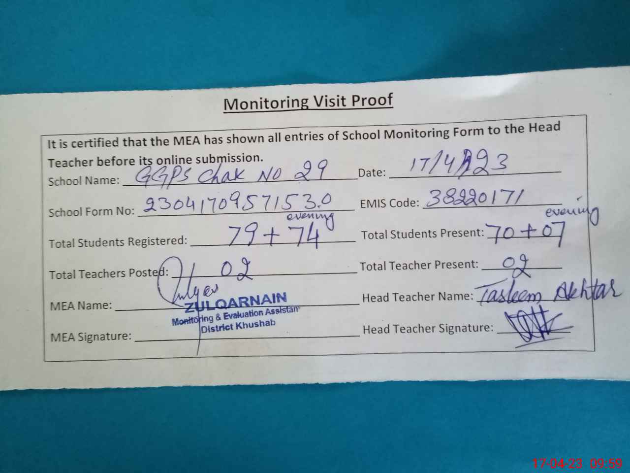 | EMIS Code: 38220171 | Name of School: GGPS CHAK NO 29 MB | |||