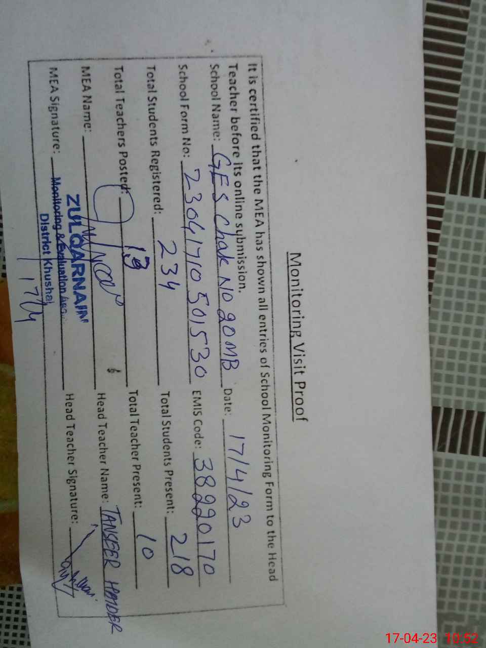 | Attendance Register | Head Teacher | MEA with School | Visit Proof |