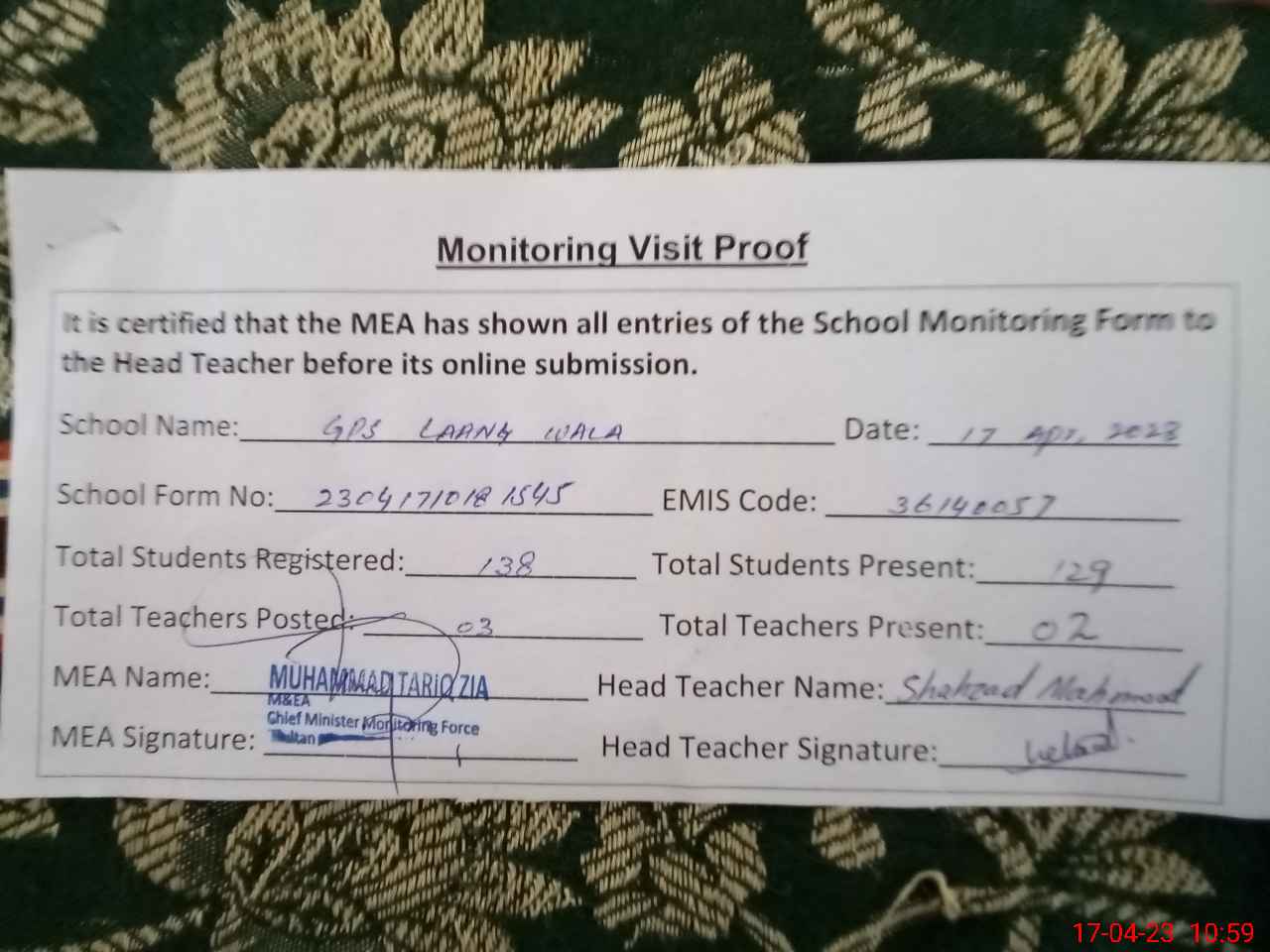 | Monitoring Date: 17-04-2023 | Start Time: 17-04-2023 10:18 AM | End Time: 17-04-2023 11:01 AM | Name of MEA: Mu**** Ta**** Zi**** | |