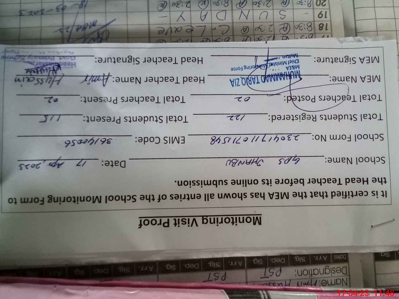 | Attendance Register | Head Teacher | MEA with School | Visit Proof |