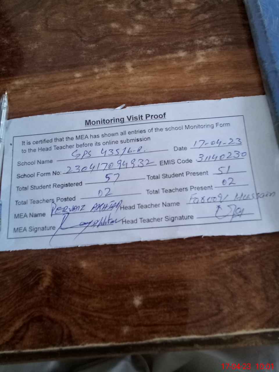 | Attendance Register | Head Teacher | MEA with School | Visit Proof |