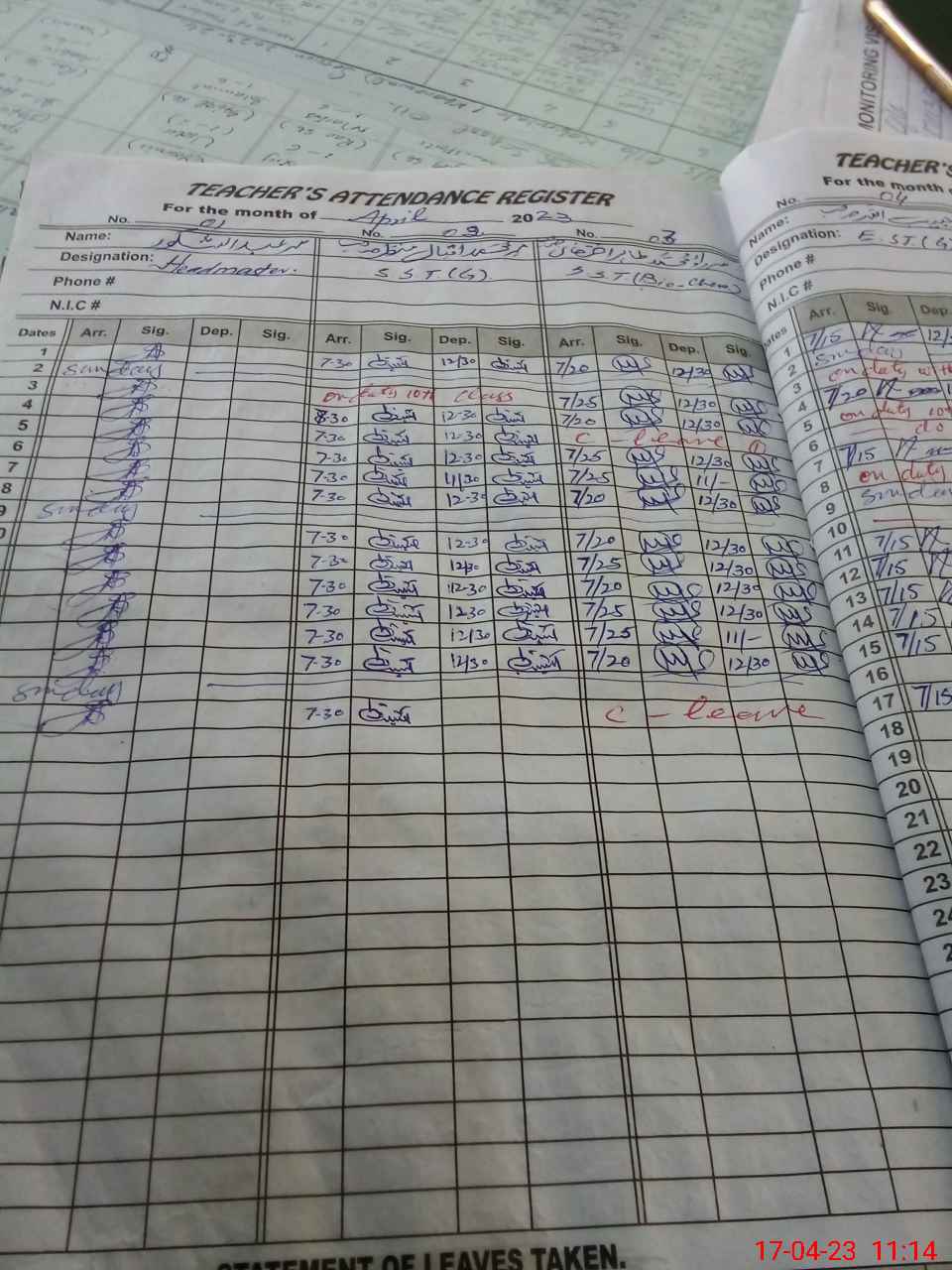 | CNIC | Full Name | Designation | R/C | Absence During Last Calender Month |