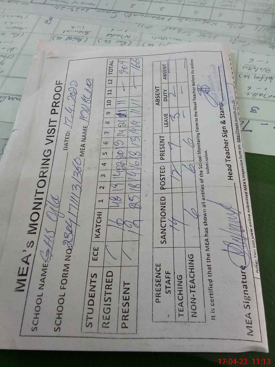 | Attendance Register | Head Teacher | MEA with School | Visit Proof |
