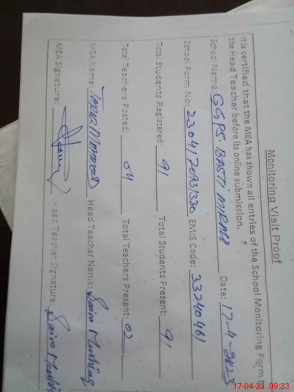 | Attendance Register | Head Teacher | MEA with School | Visit Proof |