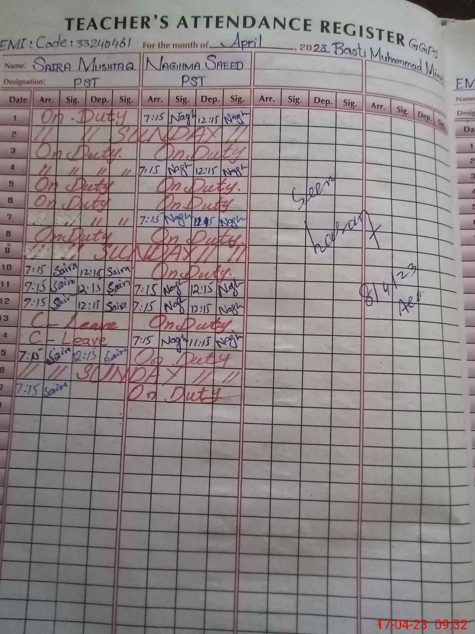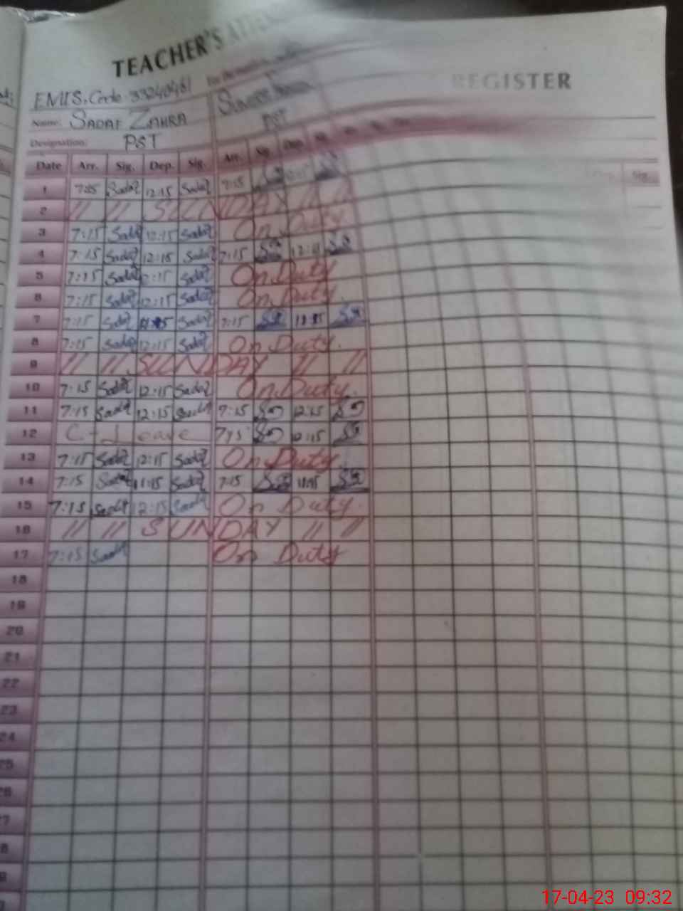 | 33**** | Su**** Pa**** | PST | Regular | 0 | 0 | 0 | 0 | 0 | 0 | 0 | 0 | 0 | Exam Duty |
