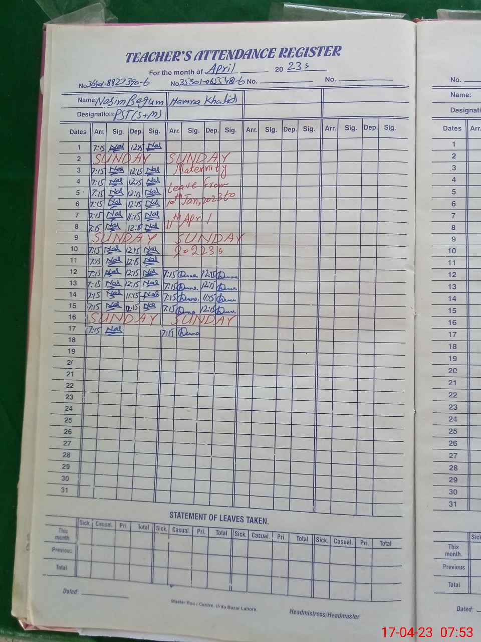 | Leave | Duty | Absent | Maternity | Medical | Ex- Pak |