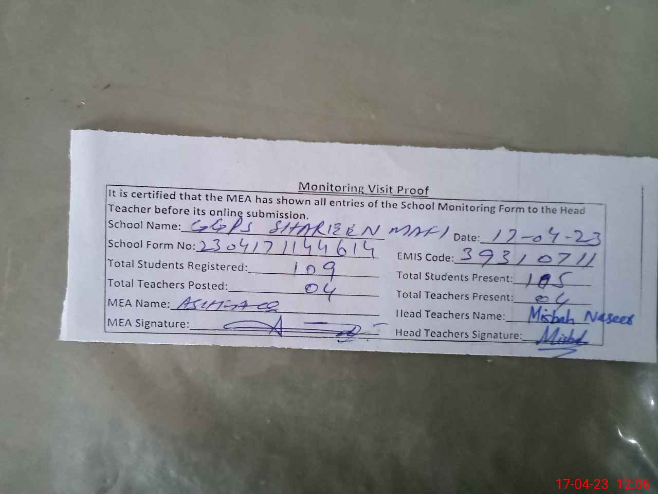 | Attendance Register | Head Teacher | MEA with School | Visit Proof |