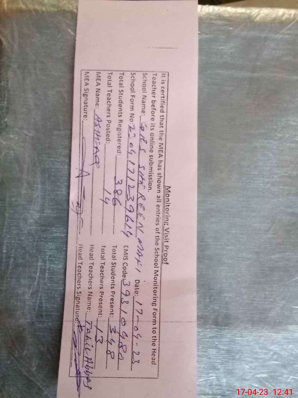 | Attendance Register | Head Teacher | MEA with School | Visit Proof |