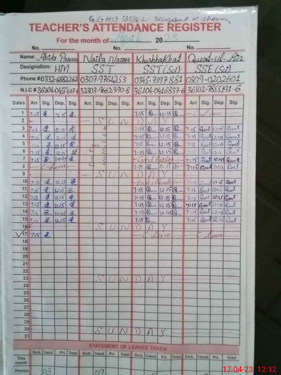 | Name: SA**** AB**** Designation: (School Headmaster's/Headmistress's) SST GENERAL Phone/Cell Number: 03**** |