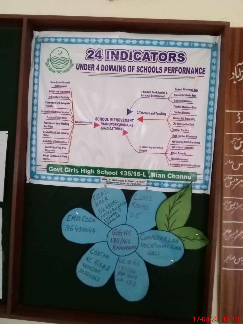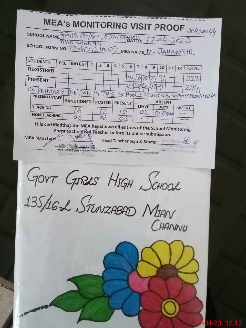 | EMIS Code: 36430044 | Name of School: GGHS 135/16-L, STUNZABAD, MIAN CHANNU | |||