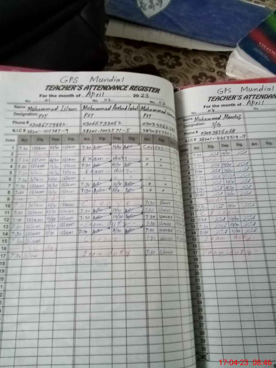 | 38**** | Mu**** Ar**** Iq**** | PST | Regular | 0 | 0 | 0 | 0 | 0 | 0 | 0 | 0 | 0 | Exam Duty |