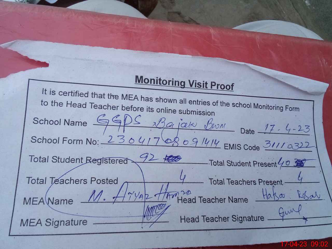 | Attendance Register | Head Teacher | MEA with School | Visit Proof |