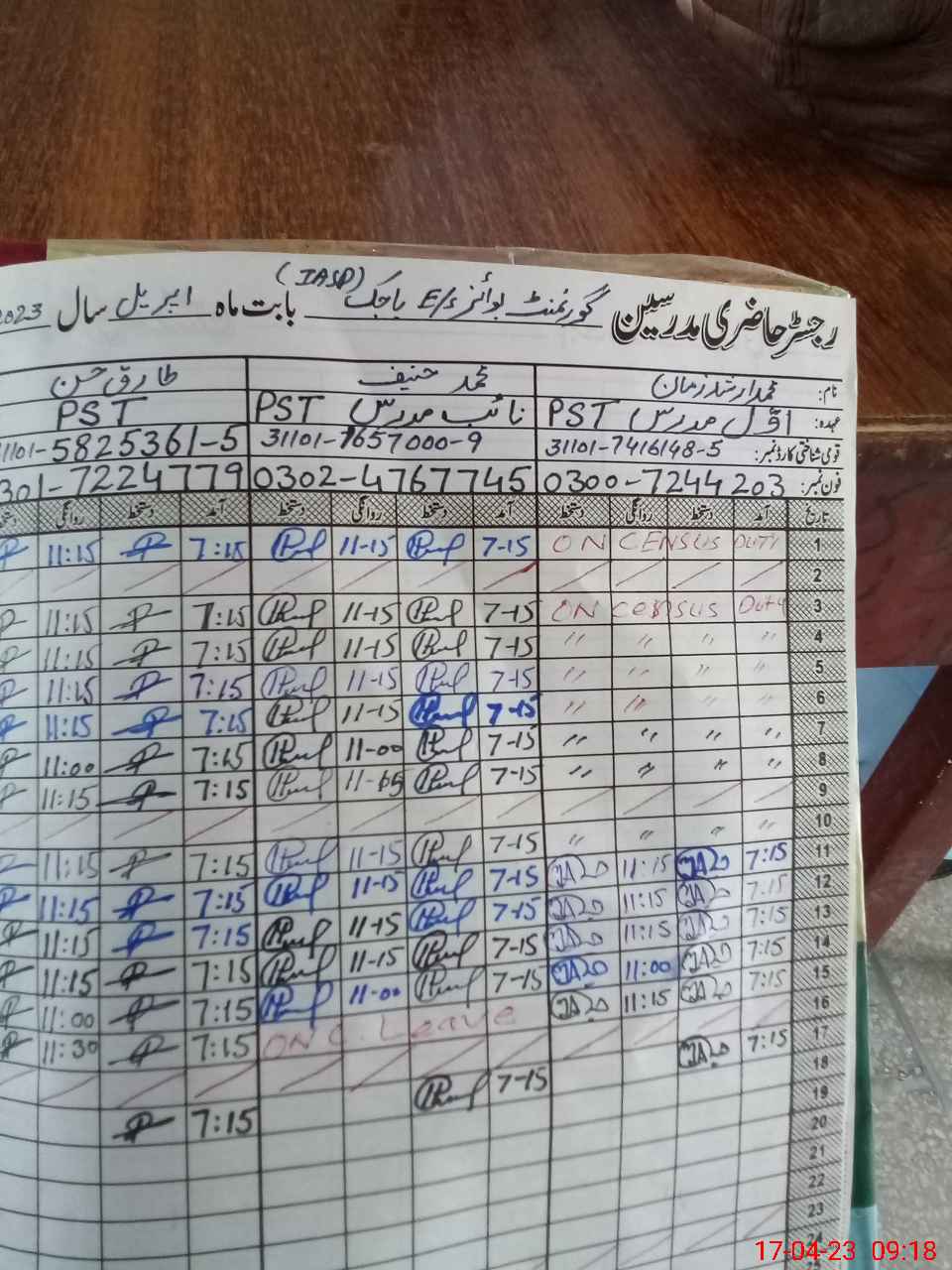 | CNIC | Full Name | Designation | R/C | Absence during last cal. month |