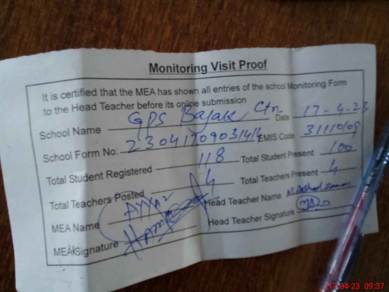 | Attendance Register | Head Teacher | MEA with School | Visit Proof |