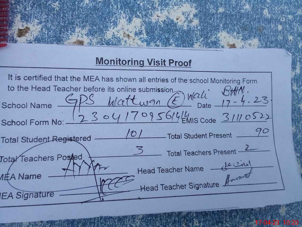 | Attendance Register | Head Teacher | MEA with School | Visit Proof |