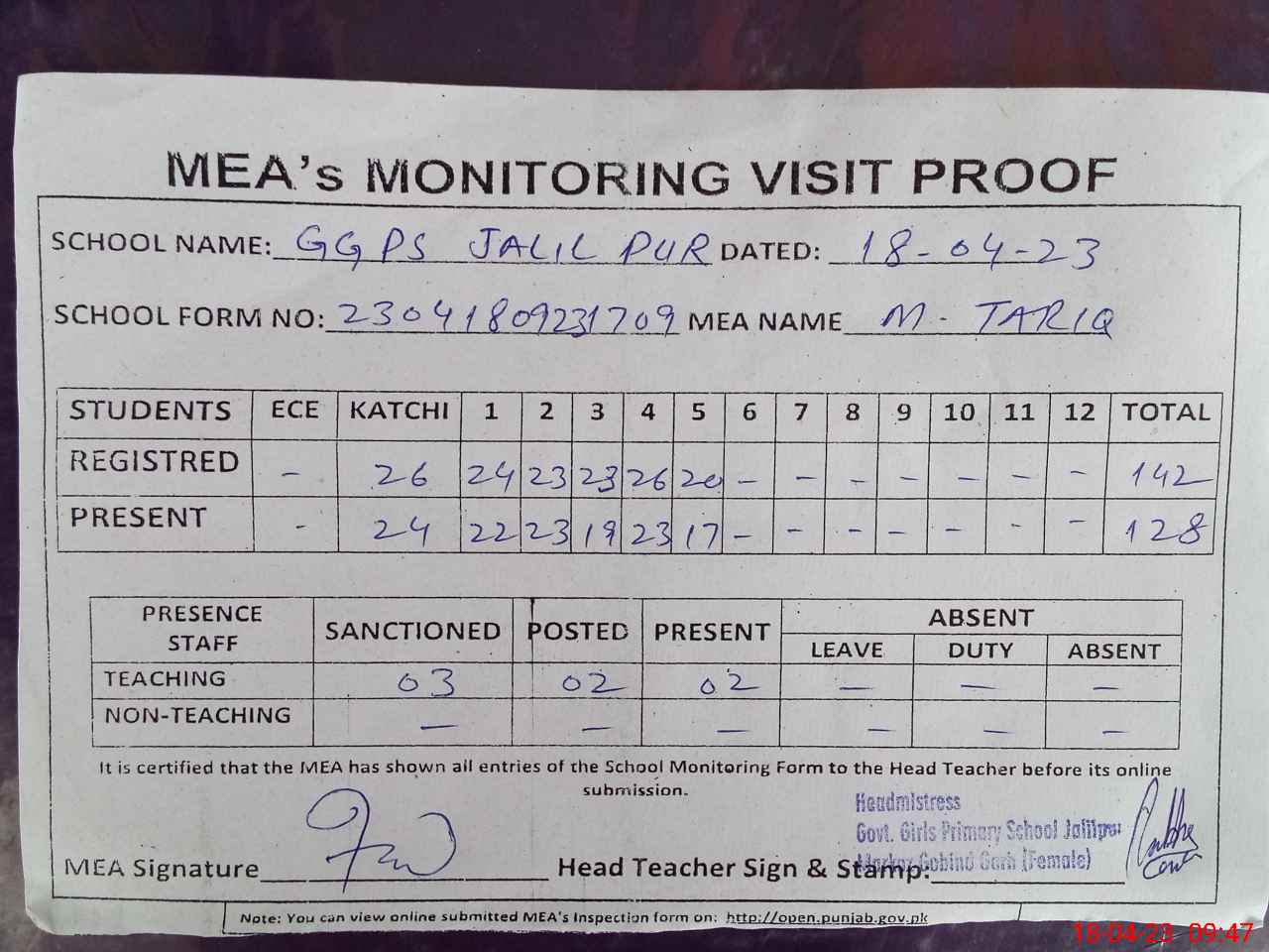 | Attendance Register | Head Teacher | MEA with School | Visit Proof |
