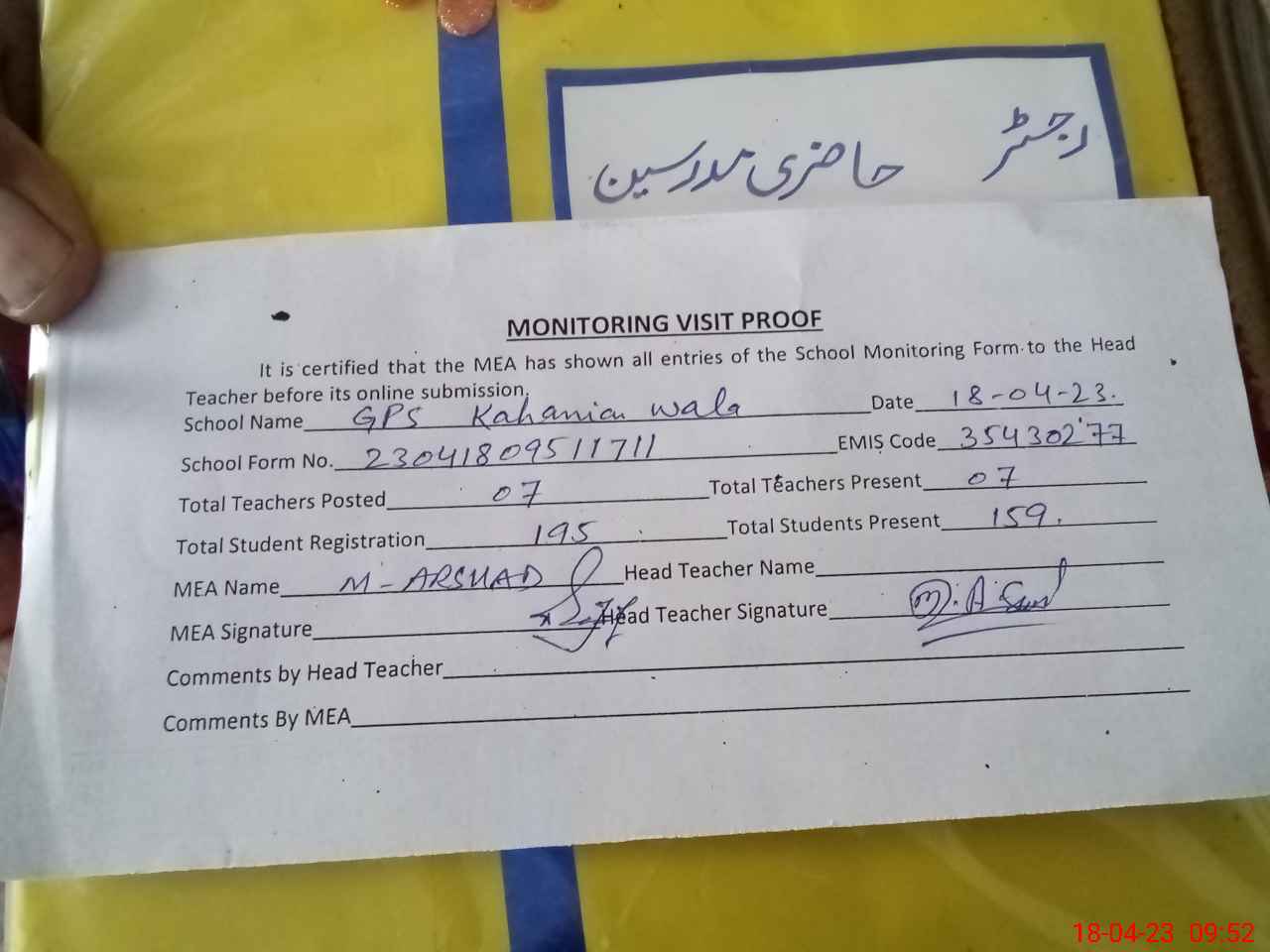 | Attendance Register | Head Teacher | MEA with School | Visit Proof |