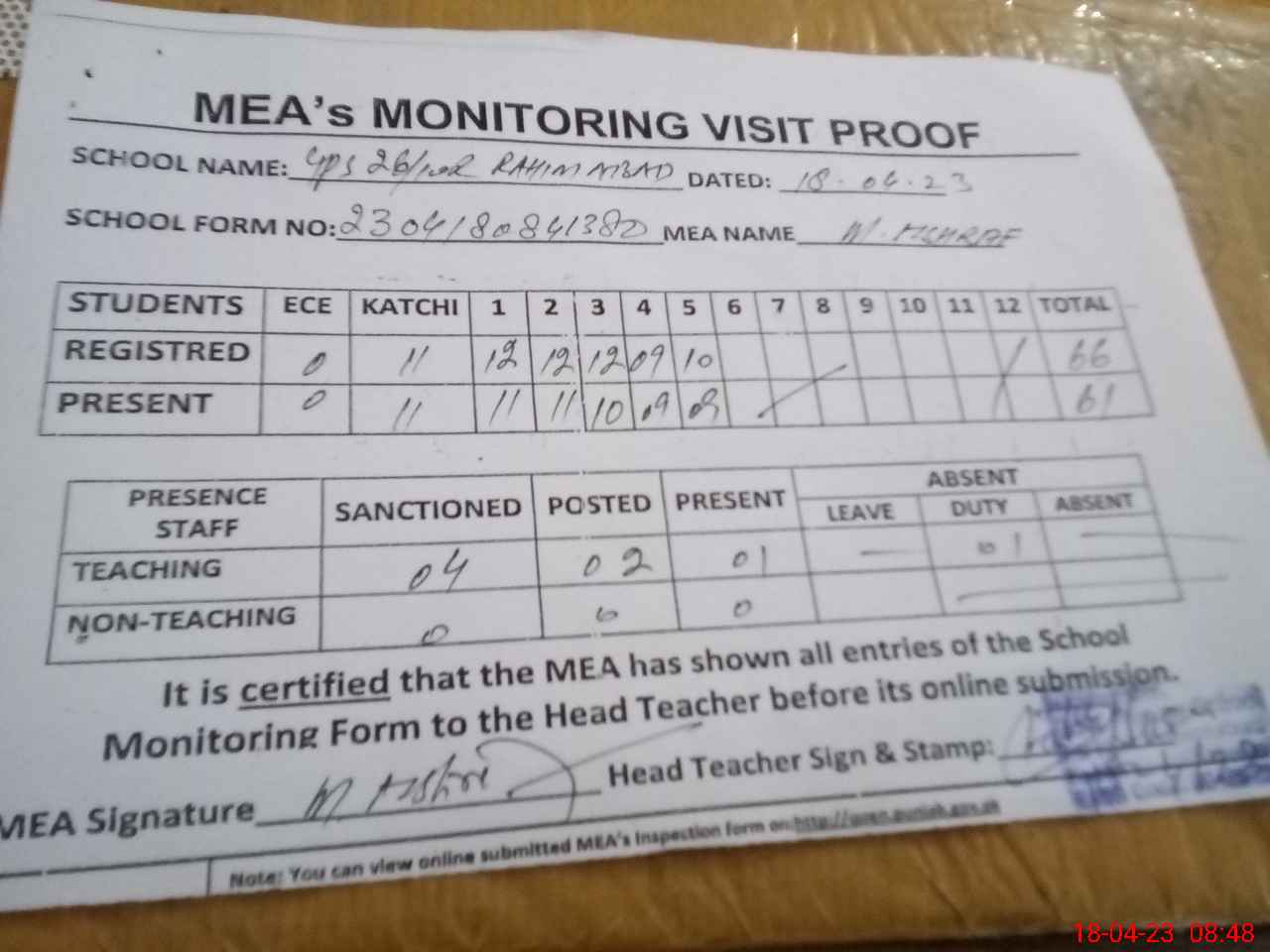 | Attendance Register | Head Teacher | MEA with School | Visit Proof |