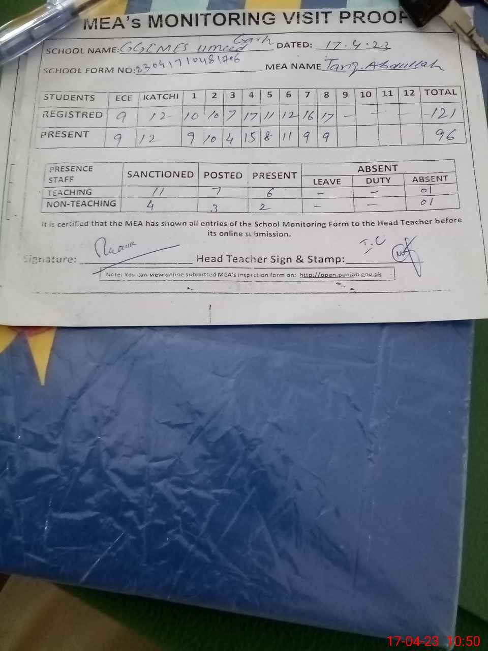| Attendance Register | Head Teacher | MEA with School | Visit Proof |