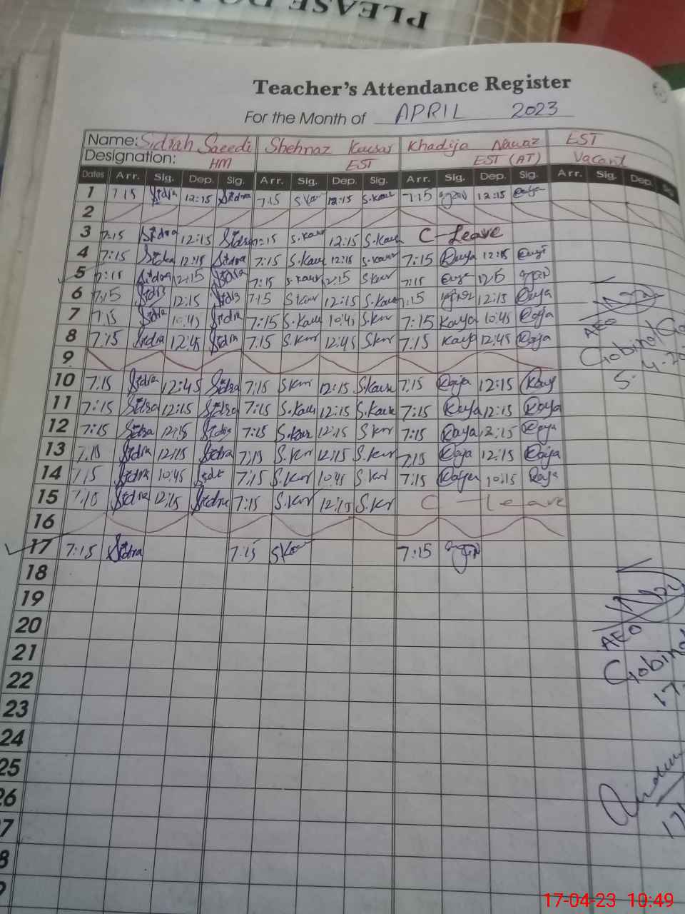| CNIC | Full Name | Designation | R/C | Absence During Last Calender Month |