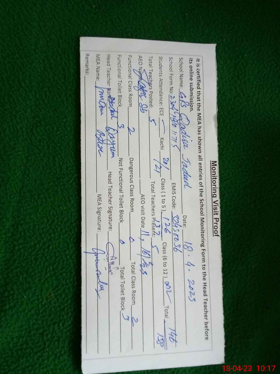 | Attendance Register | Head Teacher | MEA with School | Visit Proof |