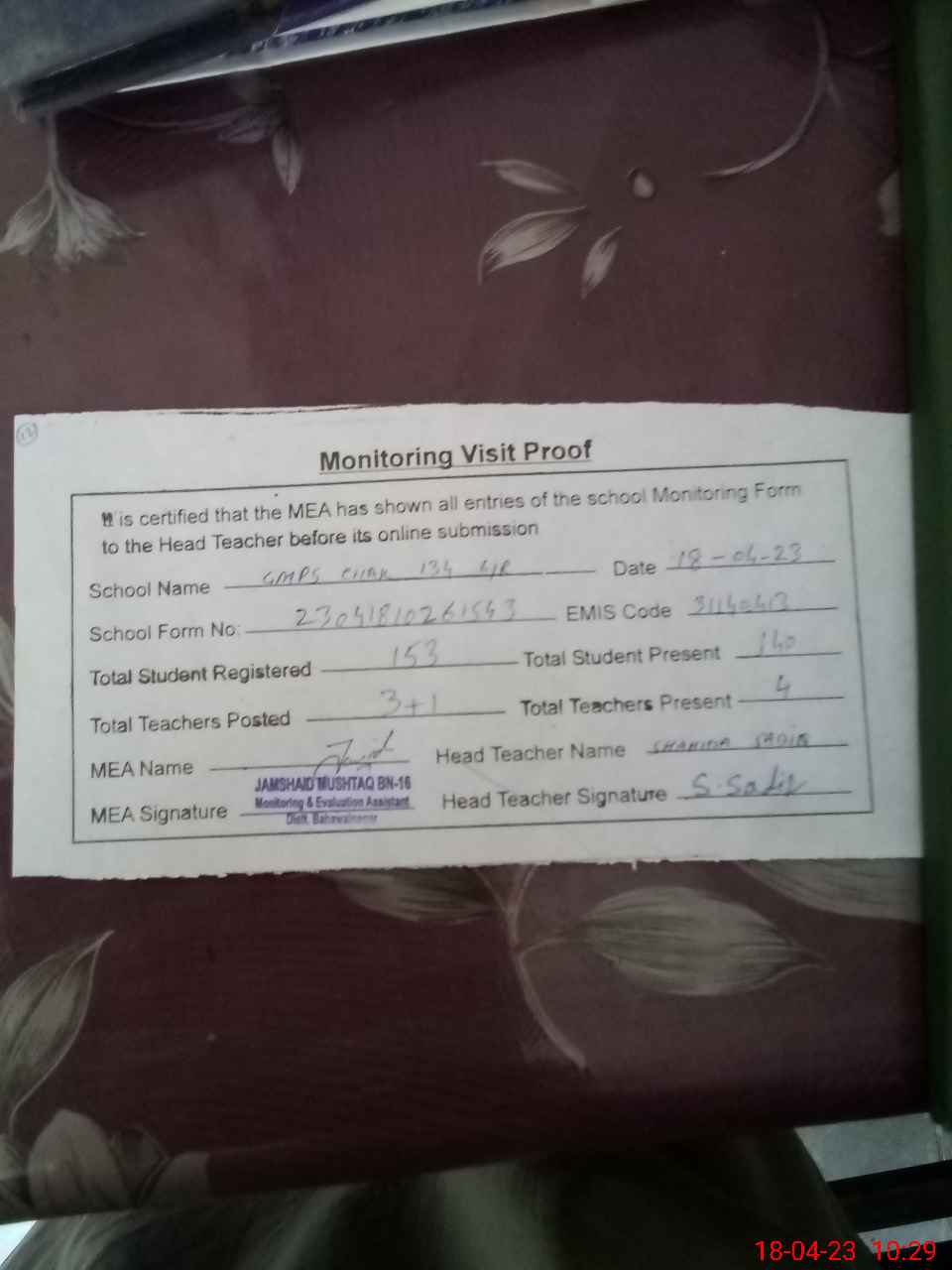 | Attendance Register | Head Teacher | MEA with School | Visit Proof |