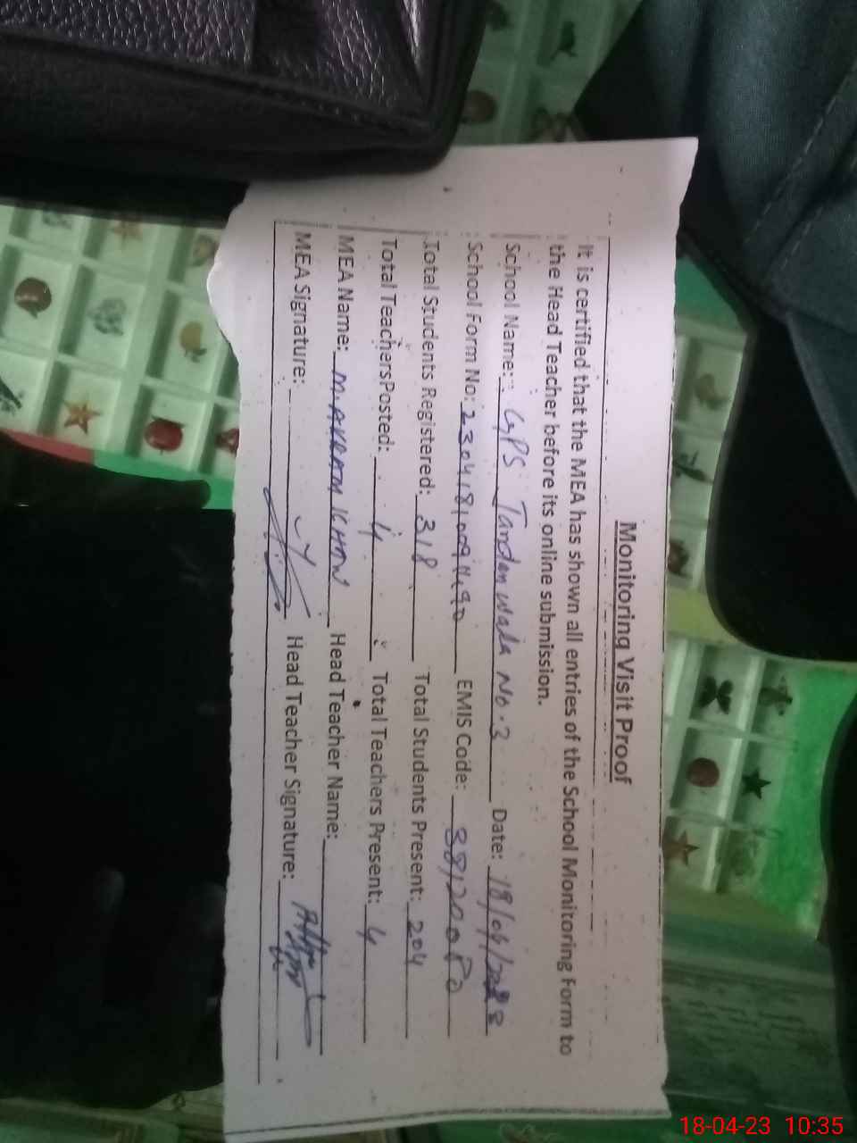 | Attendance Register | Head Teacher | MEA with School | Visit Proof |