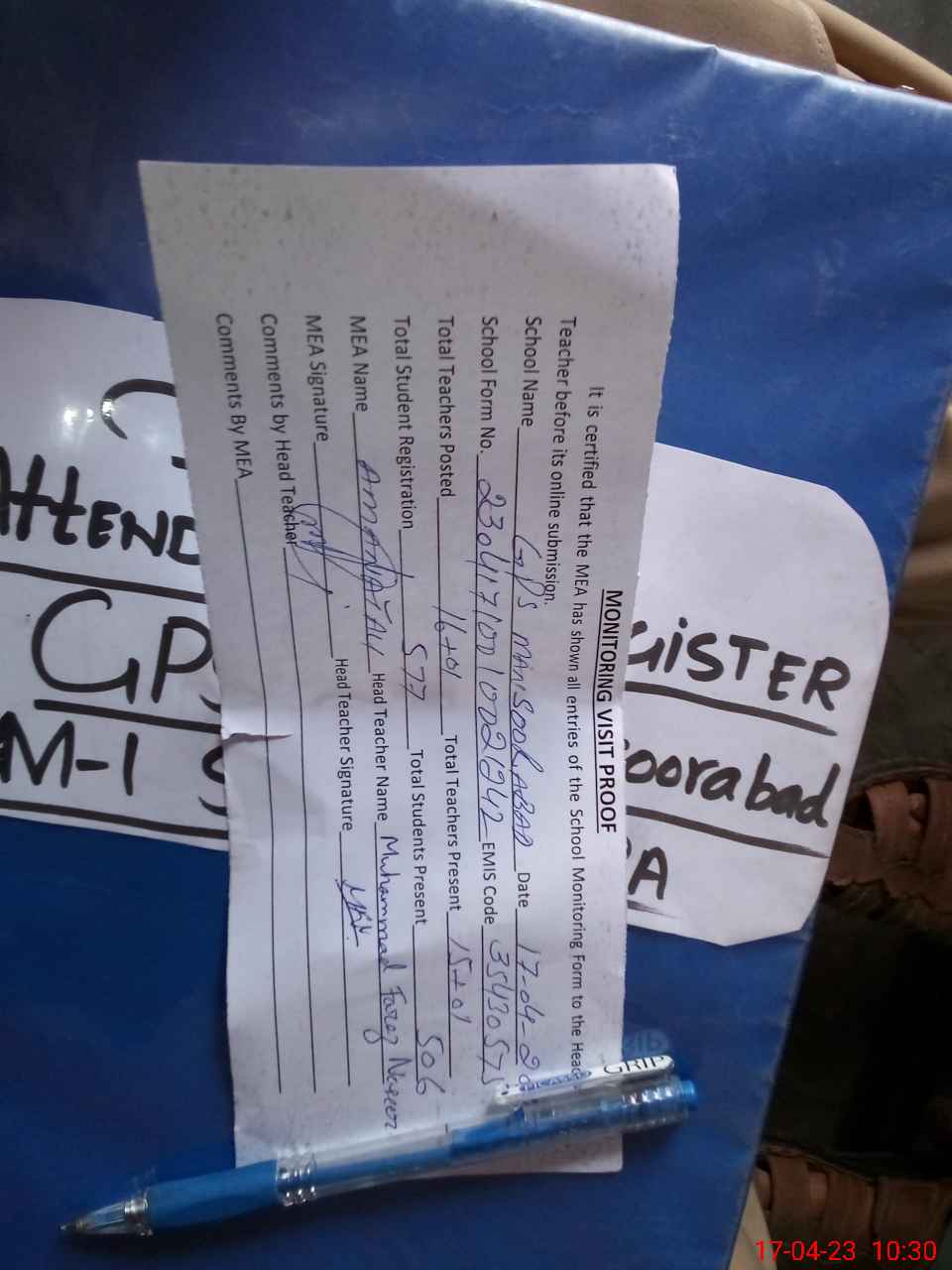 | Attendance Register | Head Teacher | MEA with School | Visit Proof |