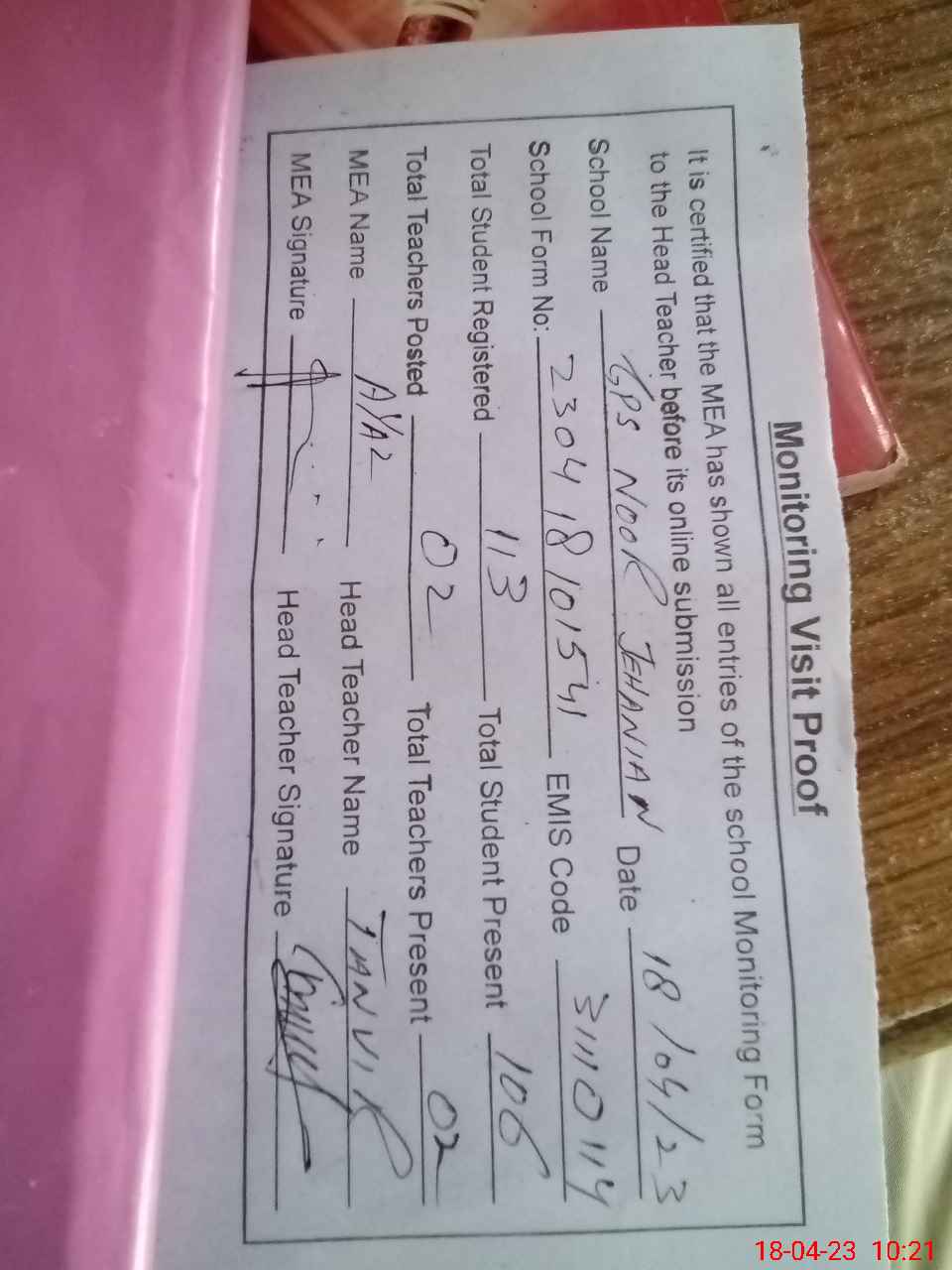 | EMIS Code: 31110114 | Name of School: GPS NOOR JAHANIAN | |||