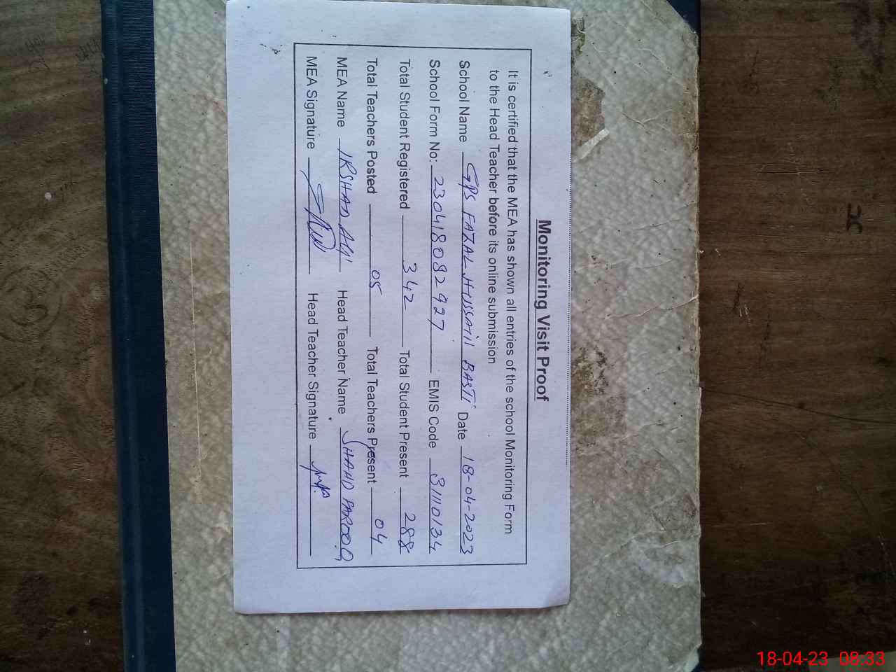 | Attendance Register | Head Teacher | MEA with School | Visit Proof |